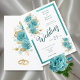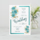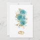 Este belo convite para o casamento apresenta um buquê de rosas de talheres e turquesas com folhas de ouro num fundo branco clássico.