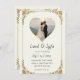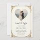Um convite de casamento elegante e moderno, com um sofisticado design com uma reviravolta criativa: uma delicada imagem transparente do casal feliz, noiva e noivo, articamente integrado ao fundo, ou colocado dentro de uma moldura decorada com folha de ouro enfeitada com delicados padrões intrincados, suas bordas ligeiramente desgastadas por um toque de charme de vintagem, contra um fundo personificado branco ou creme texto personalizado, com linhas fluentes, fontes elegantes e opções de fontes serif, perfeito para adicionar detalhes de casamento, e completado com um sutil efeito emboscado para dar ao convite uma sensação de luxo e alta qualidade.
