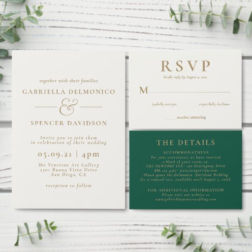 Este convite elegante de casamento apresenta um design moderno chic. A frente é um creme com uma tipografia de ouro moderna, enquanto o reverso é um rico esmeralda verde com suas iniciais em uma tipografia de ouro.