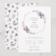 Convite para Casamento Elegante Roxo. Suave, sonhadora e romântica, este convite de casamento para na moda apresenta um buquê de aquarelas maravilhoso de folhas e flores pintadas manualmente em tons monocromáticos de roxo, ameixa e pintas moles com script e texto roxo correspondentes em um quadro de ouro rosa. O verso do convite inclui um padrão na moda e caprichoso. Encontre itens correspondentes na Coleção de Casamentos Botânicos Roxos Elegante.