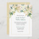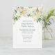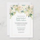 Uma gota em cascata de convites para casamentos de cor d'água com rosas natas e brancas e ouro e folhas verdes e outros verdes sobre uma estrutura de ouro pálido. O fundo é ouro pálido com flores dispersas. O modelo é fácil de personalizar - seu nome é um elegante roteiro de caligrafia manuscrito e o corpo é uma fonte moderna.