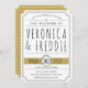 O convite de casamento do estilo de tipografia branco e preto moderno acentuou-se com o ouro. Ele tem um talento de vintage e mostra seu texto em preto em branco e a data do seu casamento em uma faixa de ouro. Há uma borda dupla preta em volta dela. As costas incluem um padrão com cruzes brancas em ouro.