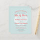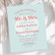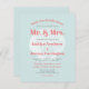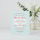Este convite para o casamento na praia contém as palavras "Sandy Toes & Salty Kisses", "Sr. & Sra.," e os nomes da noiva e noiva em tipografia coral cor-de-rosa arrojada sobre uma ilustração branca vintage da casca de couro cabeludo em um sutil fundo azul aqua.