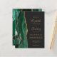 A borda esquerda deste elegante convite de casamento moderno apresenta uma esmeralda verde aquarela agate borda com falsa brilho dourado. O texto personalizável combina manuscritos dourados, copperplate e fontes itálicas em um fundo de cinza de carvão escuro. O verso apresenta um design emerald verde e dourado.