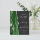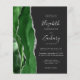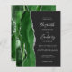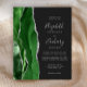 A borda esquerda deste elegante convite de casamento moderno apresenta um caçador de aquarela verde agata borda com falso brilho prateado. O texto personalizável combina manuscrito, fontes em copperplate e itálico em cinzas prateadas leves em um fundo fora do preto. O verso apresenta um design verde e prateado correspondentes.