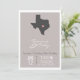 Um convite de casamento branco e esticado, com uma cinza da silhueta do Texas com coração. A parte de trás do convite tem um design.