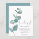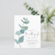 Convite De Casamento Eucalyptus Azul Elegante. Um alternativo de 4,5 pol x 5,6 pol com preço inferior. Disponível em um STOCK DE CARTÃO SEMI-GLOSS 110 lb, que é a opção padrão (mais espesso para convites), OU um STOCK de PAPEL THINNER FINISH 80 lb FINISH (ideal para gabinetes). Os envelopes são um extra opcional e são ligeiramente maiores que o tamanho da placa. . Um galho elegante de folhas de eucalipto azuis que fluem do lado esquerdo. Os envelopes são um extra opcional. Uma tipografia na moda em preto para o título principal de Casamento de complementar o resto do texto que você pode facilmente personalizar.