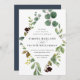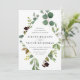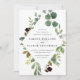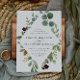 Elegantes convites de casamento botânico para convidar tons de verde, seus detalhes de casamento enquadrados por uma borda geométrica de folhagem verde de cor aquática, pequenas flores de marrom, botões e folhas.