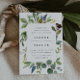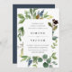 Elegantes quadros de convites de casamento botânicos, seus detalhes de celebração de casamento com uma borda de folhas de eucalipto de cor d'água, flores azuis e folhagem verde. Convites inverso a marinho enfumaçado sólido azul.