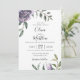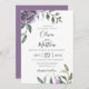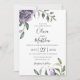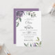 Flores de aquarela em tons quicos de roxo com ramos botânicos verdes, convite para casamento. Coordenação sólida de suporte a cores roxas.