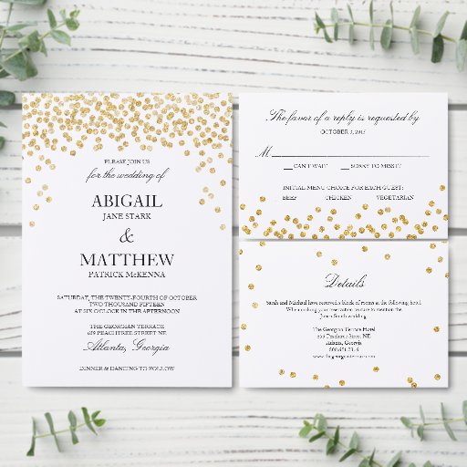 Estes convites de casamento confete são a forma perfeita de celebrar o seu casamento! O ouro falso divertido e o design de confete brilho emparelhado com a tipografia quic tornam este design perfeito para qualquer ocasião glamourosa!