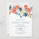 Uma ilustração adorável enfeita este Primavera ou este jardim de Verão, um convite temido de casamento que é enfeitado com flores de damasco e corais, flores de cereja cor-de-rosa e esbranquiçada, botões florais azuis e um verde-sorvido. O esquema de cores azul e damasco é moderno e atual. Disponível também em vários estilos de tipografia diferentes.