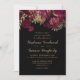 Um belo convite para o casamento, com uma borda floral de cor d'água em tons de burgundy, aparados com folhas de folha falsa de ouro e folhas brilhantes, sobre fundo escuro. Personalize o texto dourado com os nomes da noiva e do noivo em escrita decorativa. A parte traseira da placa apresenta um design floral correspondente.