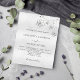 Um convite de casamento moderno, elegante e minimalista. Fundo metálico de aspecto fino prateado decorado com florais prateados. Personalize e adicione seus nomes e detalhes do casamento. Letras pretas coloridas.