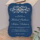 Incêndio aos seus convidados com este elegante convite de casamento, com um belo design florescente contra um fundo azul. Basta adicionar os detalhes do seu evento neste modelo fácil de usar para torná-lo um convite de tipo único. Sacudir a placa para revelar uma textura azul de cintilação prateada na parte traseira da placa.