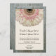 Um convite de casamento com uma imagem de uma margarida de gerbera rosa e branca no topo. A fronteira de todos os lados é o lenhador. Voltar é o Barnwood. Personalize o texto com detalhes da sua ocasião.