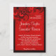 © Sunny Mars Designs - Hibiscus Floral: Vermelho Escuro em Convites de casamento de 5" x 7" Vermelhas - Chic personalizável, moderna, moderna, elegante, convites formais de casamento clássicos com ilustração de um design floral de hibisco vermelho escuro contra um fundo vermelho brilhante.