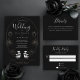 Um na moda, gótico, convite de casamento em papel orçamentário (papel mais fino) em preto, tons de ouro e branco. Ele tem uma estrutura floral com rosas. Este convite mistura um humor memorável com elegância, deixando-te design o teu casamento como quiseres. Simplesmente adicione seu texto, adicione este convite ao seu carrinho, depois faça um casamento que comece sua nova vida e veja tudo no final. (A opção de papel satin é muito fina e outras opções de papel são sugeridas.) Design de Feriado de Feriado Negro Floral | ©Melissa Patton - Designer