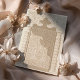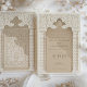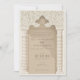 Este convite para o casamento é uma obra-prima da design, inspirando-se na grandiosidade da arquitetura islâmica e nos intrincados padrões do lugar. Renderizado em uma sofisticada paleta de alabastro, arenito e trigo, o convite expele uma opulência silenciosa. A design da frente apresenta um impressionante motivo de arco, reminiscente de uma majestosa entrada da mesquita, flanqueada por colunas elegantes adornadas com um padrão de fenda ziguezague em tons de taupe e verde. Acima do arco, o elaborado trabalho de rolagem cria um efeito mesmerizador, como se se olhasse para o teto ornamentado de um cenário palatial. Esta peça requintada não é apenas um convite, é uma porta para uma celebração que promete ser tão magnífica quanto o próprio design.