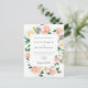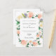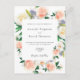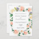 Um convite de casamento floral em branco, coral e pêssego. Um fundo branco chic na frente. Decorados com flores grandes e peludas, florais em branco, coral e pêssego. Modelos para os nomes e detalhes do casamento. Texto das cinzas escuras. Voltar: sem cor de fundo. Dica: Se você não quiser que pareça um cartão postal, clique em personalizar, vá para o verso e remova o divisor e o carimbo de posto.