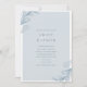Design de convite para casamento azul moderno, com uma fronteira com design de folha e uma mistura de fontes clássicas.