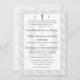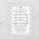Design apresenta a aparência de um local branco como fundo do formato católico tradicional para um convite de casamento. O monograma das primeiras iniciais de noiva e noiva é apresentado no topo de cada lado de uma cruz prateada. O texto é exibido em um apoio branco, com a imagem esmaecida do primeiro sobrenome inicial do casal como plano de fundo para texto. Muito elegante. Projetado para coordenar com a coleção de Suite Casado Monograma Católico de Lace Branco.