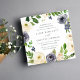 Nosso convite para o casamento de Blueberry Lane em forma quadrada envolve seus detalhes do dia do casamento com uma coroa de flores de aquarelas e bagas em marfim e azul-indigo, acentuado com folhas botânicas e folhagem verdes.