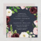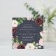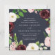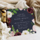Nosso convite para o casamento Blush Romance em forma quadrada envolve seus detalhes no dia do casamento com uma coroa de flores de aquarela em marfim, burgundy marsala e rosa-pincel, acentuados com folhas botânicas verdes e escamosas e folhagem contra um rico fundo azul-da-noite.