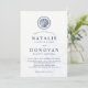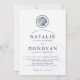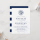 Convites de casamento personalizados em estilo náutico, com um esquema de marinho escuro e branco. A frente do convite apresenta uma ilustração da concha seguida das informações do dia do casamento. Desvanecida ao fundo é um rosa de vento Compass no estilo náutico vintage. No verso do convite está um marinho escuro e um padrão listrado branco para complementar a aparência e o sentimento. Sinta-se livre para alterar quaisquer detalhes, como cores de fundo, tamanho da fonte, cores da fonte e muito mais, usando a função de personalização. Além disso, você pode experimentar os vários tipos únicos de papel mais espesso e cortes disponíveis. Divirta-se sendo criativo e fazer seu.