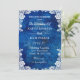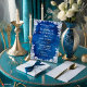 Nosso convite de casamento em azul real, como o oceano, enfeitado com um lugar elegante e tons delicados, é um cartão feito à mão que evoca a serenidade do mar no pôr do sol. Junte-se a nós num dia em que o amor e a elegância se juntam em perfeita harmonia.
