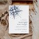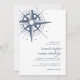O convite de casamento chic costeiro apresenta uma ilustração de bússola desenhada à mão no estilo vintage, no canto superior esquerdo, em azul-porto desbotado, com os detalhes de seu casamento em azul-marinho clássico. Perfeito para praia, verão ou casamentos náuticos, esses convites de casamento em estilo costeiro invertem-se para grandes faixas azuis e brancas.