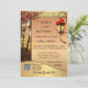 Elegante convite de casamento bócio com uma lanterna festiva com espirais florais sobre ouro com fundo de rosa. À esquerda está uma floresta de outono com folhas coloridas de outono e faíscas lúcidas. Você pode adicionar seu próprio URL do site (ou excluir o código QR) e também substituir a foto no verso por sua própria foto.