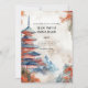 Este convite de casamento apresenta uma paisagem japonesa de uma estrutura tradicional e uma montanha ao fundo. A paleta de cor design corresponde à cor tradicional.