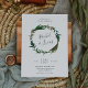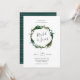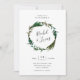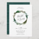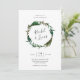 Os convites de casamento botânico elegantes apresentam uma coroa de folhas de palma tropical aquáticas verdes, cercando seus nomes em letra chic manuscrita. Personalize com seus detalhes de casamento embaixo. Convites inverso a sutil no tom com listras pintadas à mão em verde escuro.
