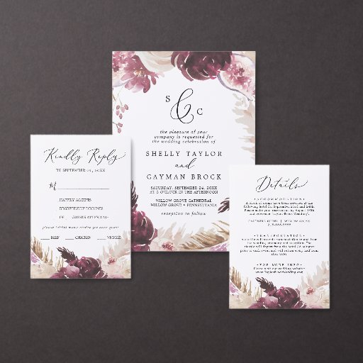 Este convite de casamento de prados de boho pampas é perfeito para um casamento de verão. O design de aquarela floral apresenta uma burgundia boêmica e flores cor-de-rosa pinceladas com ranhuras de erva-pampas neutra e folhas de palma secas de ouro.