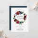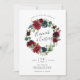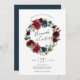 Os convites para casamentos florais elegantes contêm uma coroa de flores roxas burgundy marsala e marinhos azuis entrelaçadas com folhagem verde de eucalipto, cercando seus nomes em letra chic manuscrita. Personalize com seus detalhes de casamento embaixo.