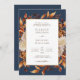 Marinho BlueTerracotta Fall Deixa Convite De Casamento. Este elegante convite de casamento apresenta belas rosas pintadas à mão, cor d'água queimada, laranja, cobre, folhas de terracota, creme e beige, e belas ferrugem e marrom sobre um fundo azul marinho, perfeito para um casamento no outono! A parte de trás do convite tem um belo galho de folhas com a noiva e o monograma do noivo. Localize itens correspondentes na Coleção de Casamentos de Romance de outono Azul de Marinho.