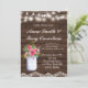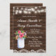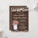 Um convite para casamento romântico de madeira com elementos de jarra de pedras e de cordões de luz.