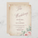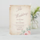 Traga a elegância do eterno para o seu dia especial com este design de convite de casamento. Apresentando um fundo de papel pergaminho angustiado com tons de sépia macios, ele é belamente acentuado por um delicado buquê de aquarela de rosas embebidos e eucalipto no canto. O olhar quente e inspirado na safra cria uma atmosfera romântica, enquanto o espaço limpo com texto editável facilita a personalização do seu evento.