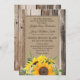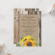 Design de convite de casamento ocidental da Rússia com buquê de girassol sobre tecido de aparência de linho e madeira de celeiro e um coração gravando com monograma no fundo.