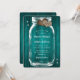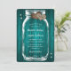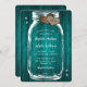 Convite de casamento teal russo com um jarro de pedras e corações de burlap em um fundo de madeira. Personalize facilmente este convite de casamento do Mason jar com seus detalhes de casamento.