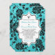 Este convite para casamentos tema damasco florais de na moda e azul-turquesa moderno, preto e branco tem grandes flores de aparência preta ou tipo rosa num fundo úmido de aqua úmido. Adicione seu próprio monograma ou logotipo. Há uma caixa de texto na parte traseira para adicionar qualquer texto extra que você queira ou pode remover a imagem e o texto traseiros e ter a aparência em apuros aqua damask como parte traseira. Seria perfeito para um casamento de aqua e de temas negros, ou para um casamento vintage ou ao estilo vitoriano. Seria também muito bom para um convite de aniversário de casamento. ***REGISTRE que não existem elementos suscitados neste convite. Tudo está impresso. O texto e o papel são todos personalizáveis.***OBSERVE que se você alterar a fonte ou o tamanho da fonte, ela pode alterar a forma como o convite impressão. Ele será impressão como você o vê no seu monitor, portanto, se você tiver problemas de alinhamento ou de dimensionamento, entre em contato comigo para obter ajuda. Não verei seu convite assim que você o solicitar e o Zazzle NÃO editará nada (digitar, alinhamento, etc.). Se você precisar de assistência ou quiser outros itens correspondentes, envie seu pedido por e-mail para niteowlstudio@gmail.com.