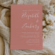 Este simples convite de casamento moderno apresenta um texto branco sobre um fundo de terracota. Adicione os nomes da noiva e do noivo na caligrafia de escrita manual do na moda e os detalhes na fonte sans serif. O reverso é uma sombra de terracota sólida.