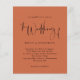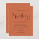 Convite de casamento de Script Terracotta Um preço orçamentário alternativo de 4,5" x 5,6". Disponível em um STOCK DE CARTÃO SEMI-GLOSS 110 lb, que é a opção padrão (mais espesso para convites), OU um STOCK de PAPEL THINNER FINISH 80 lb FINISH (ideal para gabinetes). Os envelopes são um extra opcional e são ligeiramente maiores que o tamanho da placa. Esta elegante design tem uma tipografia na moda em preto para o título de Casamento de um fundo de terracota. O resto do texto que você pode personalizar facilmente.