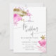 Convite para casamento de folhagem tropical aquosa com tipografia de escrita manual com um flamingo rosa e folhas de folha cor-de-rosa e douradas desenhadas para serem rápida e facilmente personalizadas de acordo com as suas especificações de evento.
