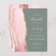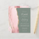 A borda esquerda deste elegante convite de casamento moderno apresenta uma cor-de-água rosa pincelada com borda falsa de ouro. O texto personalizável combina letra pálida, letra copperplate e itálico em um fundo verde de sábio profundo. O verso apresenta um design dourado e uma pincelada correspondente.