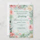 Uma colagem de rosas cor-de-rosa, pêssego e marfim, juntamente com folhas e botões, fazem uma fronteira bonito neste convite de casamento. Seu texto personalizado está em verde correspondente no centro em uma camada verde de menta semitransparente. A parte de trás do convite está combinando verde macio, com um spray de confete de ouro espumante no topo. Rosas estão sempre na moda para casamentos, e esse convite combina o velho favorito com um toque moderno. *Crédito de design Floral para CreativeQubeDesign.