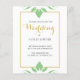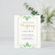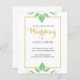Contemporâneo convite de casamento branco com uma fina borda de ouro e um motivo de folha no topo e no fundo do cartão. As cores e o texto são completamente editáveis on-line com alguns cliques, mas se você precisar de ajuda, entre em contato com o designer em ArtByLiz@gmx.com e a placa será personalizada para você sem custo extra.