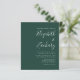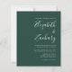 Este simples convite de casamento moderno apresenta um texto branco sobre um fundo verde esmeralda. Adicione os nomes da noiva e do noivo na caligrafia de escrita manual do na moda e os detalhes na fonte sans serif. O reverso é uma sombra de verde esmeralda sólido.