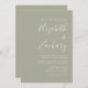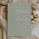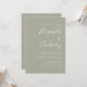 Este simples convite de casamento moderno apresenta um texto branco sobre um fundo verde sábio. Adicione os nomes da noiva e do noivo na caligrafia de escrita manual do na moda e os detalhes na fonte sans serif. O reverso é uma sombra correspondente de verde de sábio sólido.